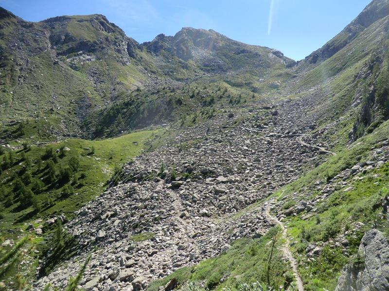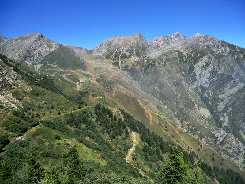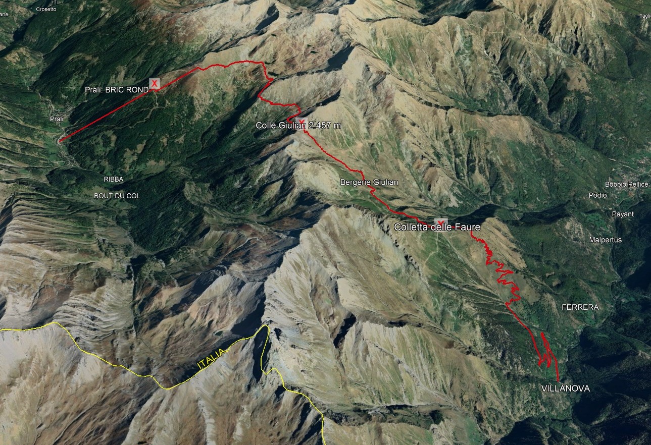 Il percorso prosegue su un'antica mulattiera ex militare che corre a mezzacosta attraversando diversi valloni fino al Colle Giulian (2.451 m), da cui si supera lo spartiacque passando dalla Val Germanasca alla Val Pellice, con il Monviso che si staglia possente di fronte a noi. Raggiunte tramite un comodo sentiero le Bergerie Giulian (2.110 m), si prosegue su una panoramica pista sterrata che, con numerosi tornanti, scende fino alla borgata Villanova di Bobbio Pellice (1.230 m).