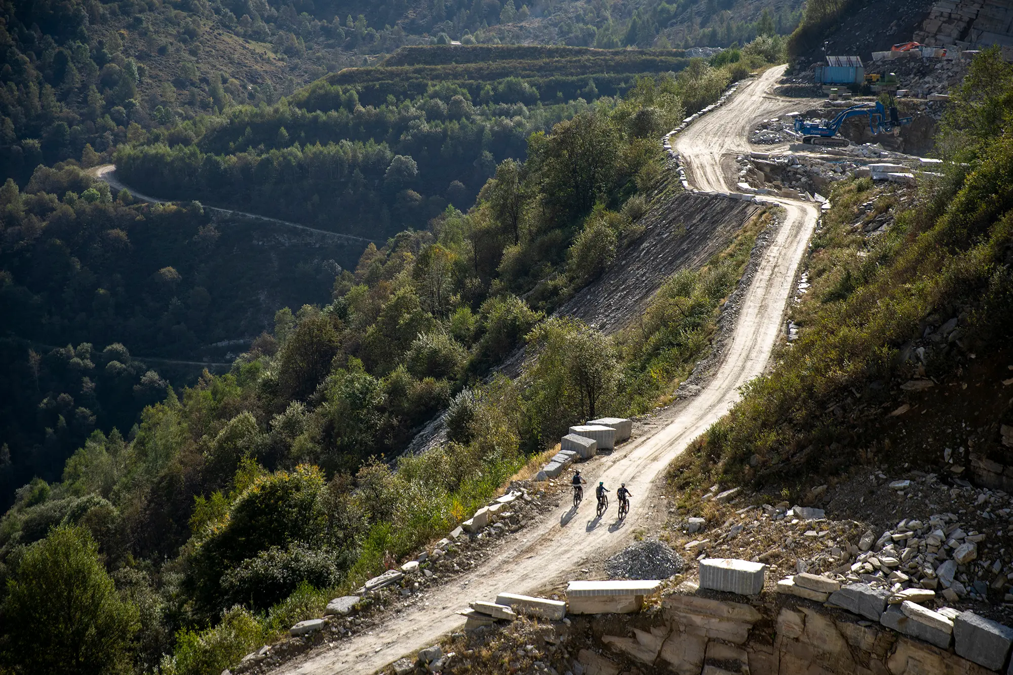 Si scorgono finalmente le prime cave dove si affronta una strada di colore bianchissimo, fatta di dossi e avvallamenti creati dai mezzi pesanti che lavorano durante la settimana.