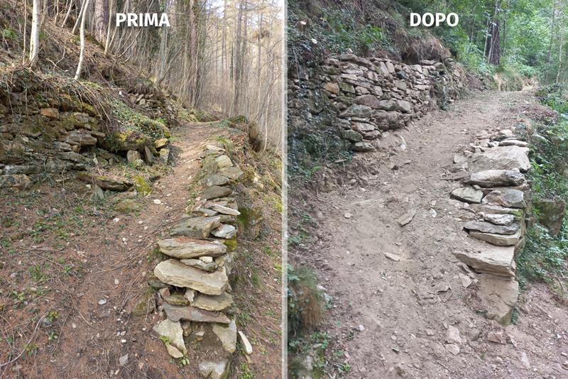 Ecco un esempio dei lavori di manutenzione e sistemazione realizzati dagli operai forestali della Regione Piemonte (che ringraziamo) sui percorsi UpSlowTour: muretto a secco lungo il sentiero del Cruello (Anello 3 "Sarsenà-Cruel-Garin"), prima e dopo l'intervento.