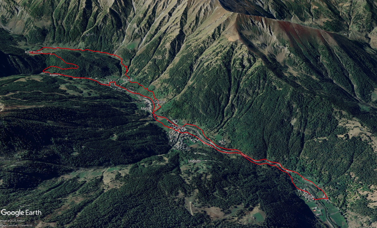 Sempre seguendo il torrente, si scende con un po' di attenzione su un comodo sentiero fino alla borgata Pomieri, poi si percorre un sentiero balcone parallelo a quello dell'andata ma leggermente più in quota, arrivando alla borgata Orgiere. Si attraversa il ponte e ci si porta a Malzat, quindi si torna a Ghigo chiudendo la prima parte dell'anello.