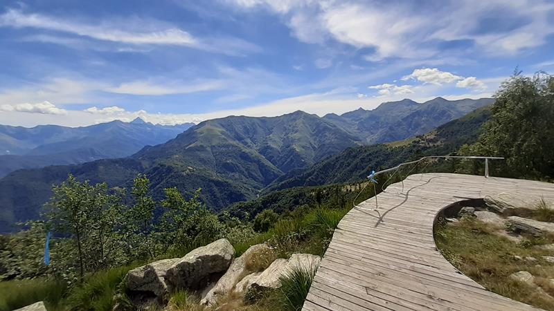 Da lì si sale al Monte Castelletto (1.512 m) per godere, dalla panchina gigante qui collocata, di una vista a 360° che include, imponente, il Monviso e la pianura fino a Torino.